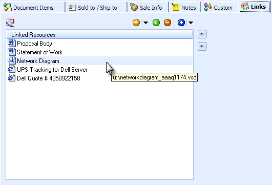 There is now a Links tab in the Quote WorkBook. Here you can link external files to the quote document. If, for example, you have created a Visio diagram or cad drawing file that is related to this quote, you can simply select these files to add them to this Links tab. You can even drag the files into the Links tab from Windows explorer. It's that easy. With all the external files related to this quote document displayed on the Links tab, finding and opening them to edit or print is so much easier now because you can just open the QuoteWerks quote, and on the Links tab, all of these files are organized for you. No more trying to remember where they are stored or going searching for them. Once you've added a file to the Links tab, you can edit the description of the file so that it is displayed as "Network Architecture Design", rather than as the file name "f:\data\VisioFiles\NetworkDesignForABCCompany.vsd".