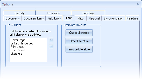 You can now set the order in which various print elements print. For example, the default is for the Cover Page to print, and then the Print Layout, and then the Spec Sheets, and then the Literature. Now, you can choose the order in which each of these types of print elements are printed. This can be set under the Print tab of the Tools|Options menu.