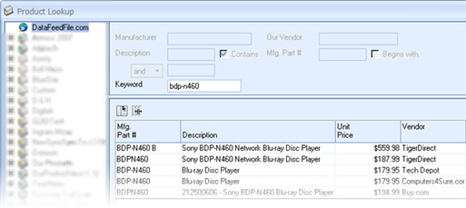 Search Online Merchants. Added support for a new Product Data Source - DataFeedFile.com. DataFeedFile.com gathers product data from thousands of Online Stores (merchants) and creates a comprehensive and searchable database, making it possible to easily compare prices between online stores. DataFeedFile.com is a free service. Using the QuoteWerks Real-time module you can search DataFeedFile.com and have access to all this information from within QuoteWerks. In the search results you can right click on the items and choose 'View Item URL' to display the selected item on the merchants website (like amazon.com or buy.com), where you can see more details about that product on that merchant's website.