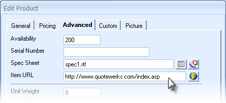 There is now an Item URL field on the Advanced tab of the Edit Product window for native product databases. With this you can specify a website page to associate with this product. When searching for the product, you can right click on it and choose 'View Item URL' to have QuoteWerks open this URL in your default web browser.
