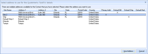 For ConnectWise users, when selecting a contact to use in the quote, if the contact has multiple sites associated with it, you will be able to choose the particular site you would want to use. Sites can be designated as Primary, Default Ship, Default Bill, and Default Mail. These designations are indicated in your selection list. Additionally, when selecting a Ship To contact for the quote, the Default Ship site will be the default selection.