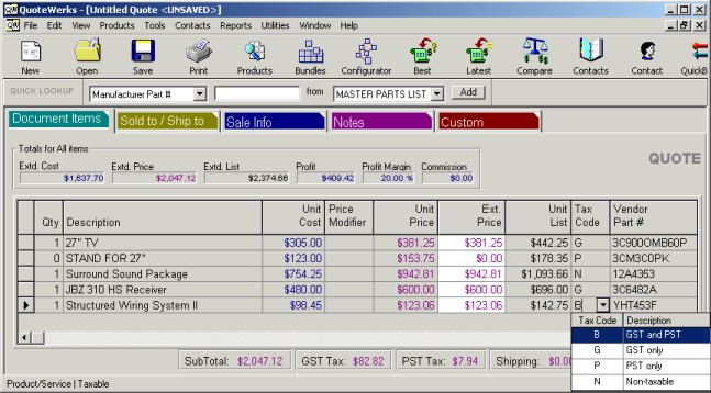 For Canadian customers, we have restructured the tax codes in build 28. You will be able to specify per each line item if GST and PST should be applied to the line item, or only PST or only GST. Before, the only option a Canadian user had was to choose either Tax or Non-Tax for each item. There was no way to differentiate between PST and GST, as most Canadian users needed to do. This option gives a Canadian user all the tax options they will need to complete their quotes.
