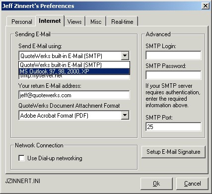 Quotes can now be e-mailed from QuoteWerks using Microsoft Outlook. If you select the Microsoft Outlook e-mail option to send your emails out of QuoteWerks, then the entire contents of the email including the to, cc, subject, message text, and attachments are logged and stored in Outlook’s history.